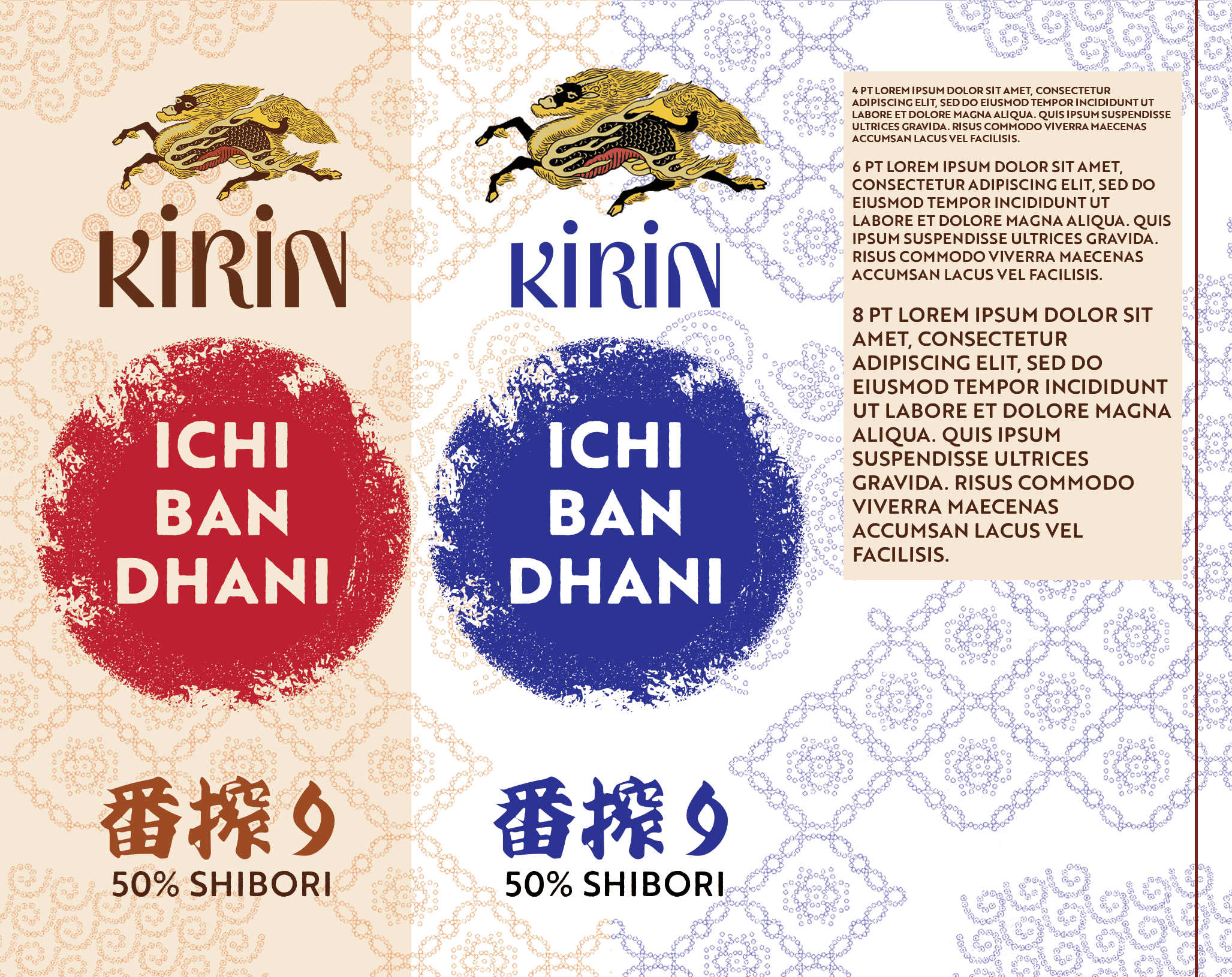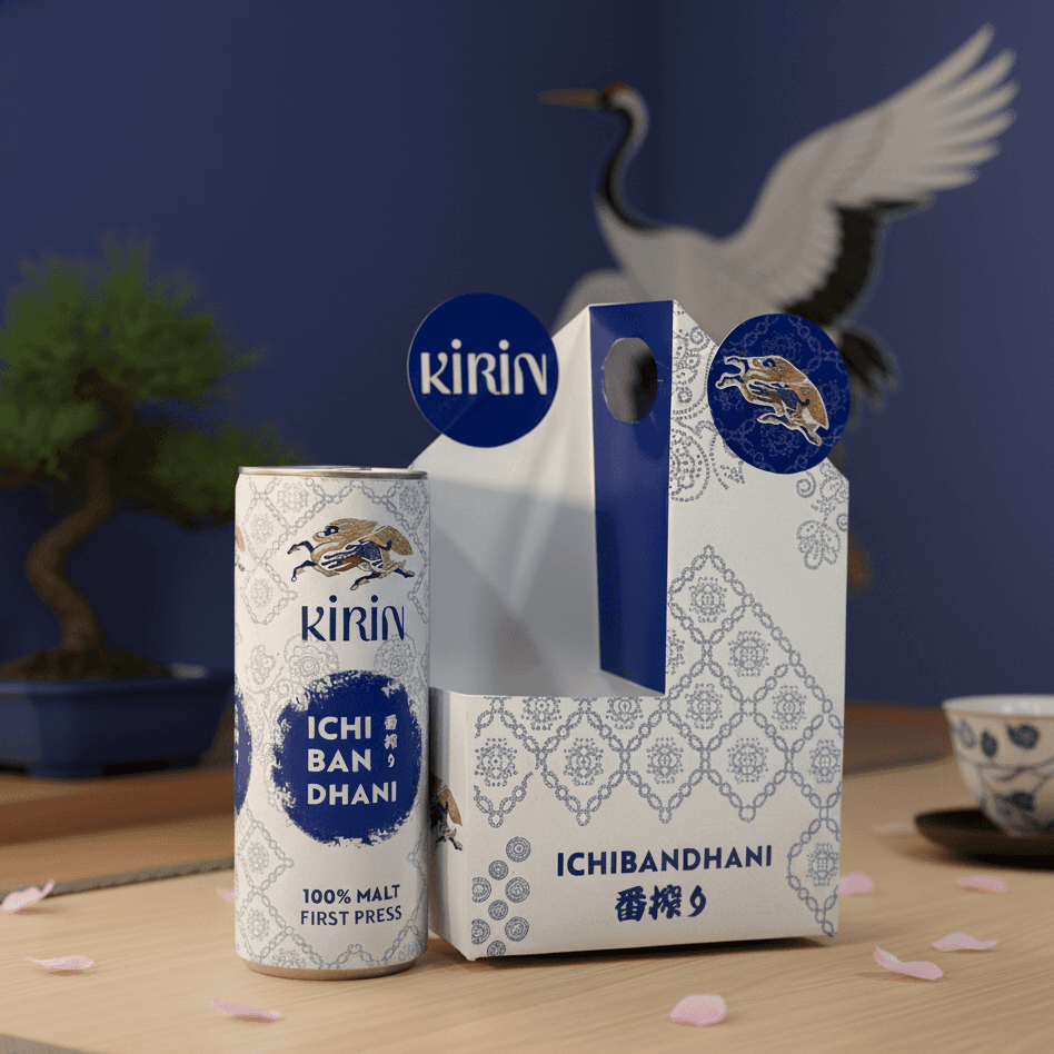 The rebrand started with refreshing the logo to feel less plain and more approachable. The real breakthrough came from research: Kirin's brewing method is called shibori, a pressing technique that extracts only the purest flavors. Shibori is also a Japanese textile pattern strikingly similar to India's bandhini, both created through wringing and binding to control dye or liquid.